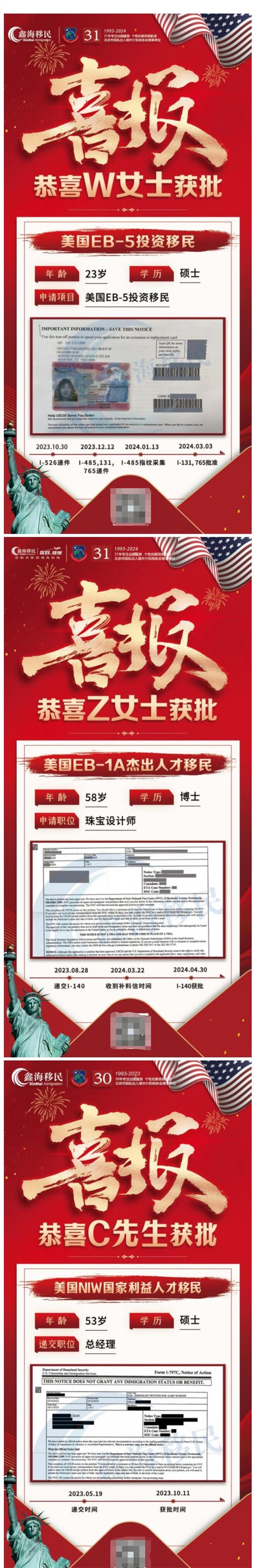 美国移民案例:恭喜W女士获批美国eb5投资移民combo卡、Z女士获批美国EB-1A人才移民I-140、C先生获批美国NIW国家利益人才I-140。
